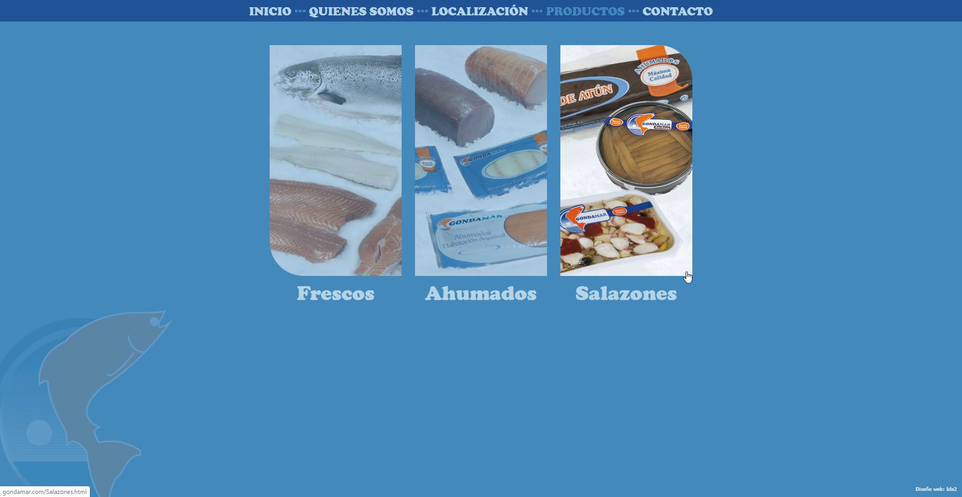 En el menú de productos podemos acceder a sus tres familias ofertadas, Frescos, Ahumados y Salazones, con una selección de ejemplos.