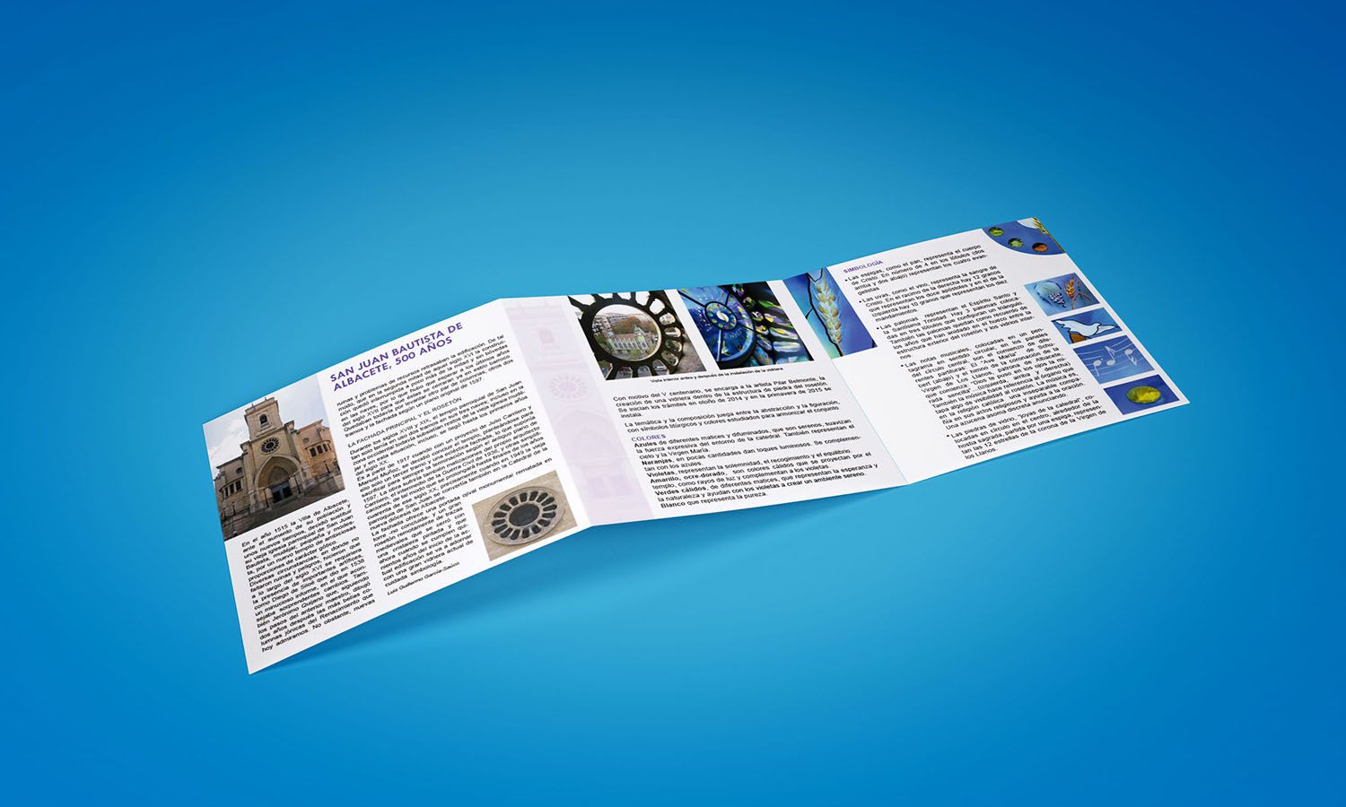 Para la inauguración, se diseñó este díptico de formato cuadrado con explicaciones del encargo, el proceso de fabricación y de montaje, fotografías del antes y el después, y la historia de la catedral.