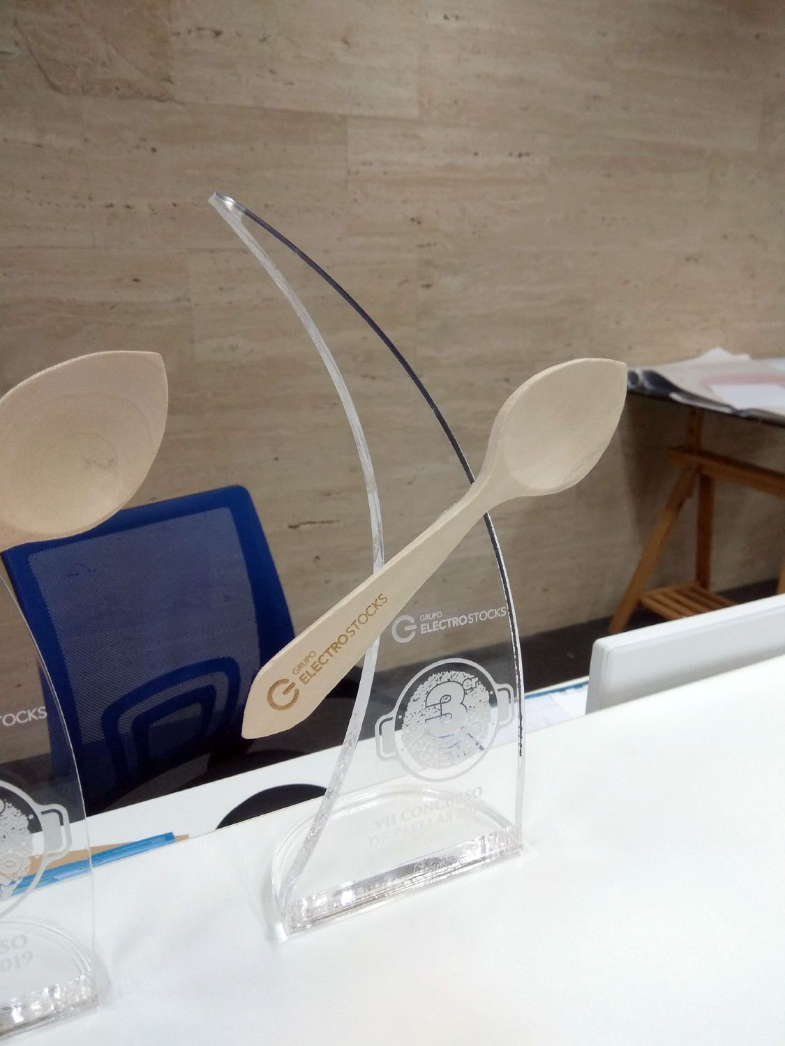 Trofeo para la VII edición del concurso de paellas organizado por Grupo Electrostocks. Se realizaron estatuillas para el 1er, 2º y 3er premio. El trofeo está realizado en metacrilato de 10mm, grabado y con peana adherida con cianocrilato, y una cuchara de madera grabada a láser.